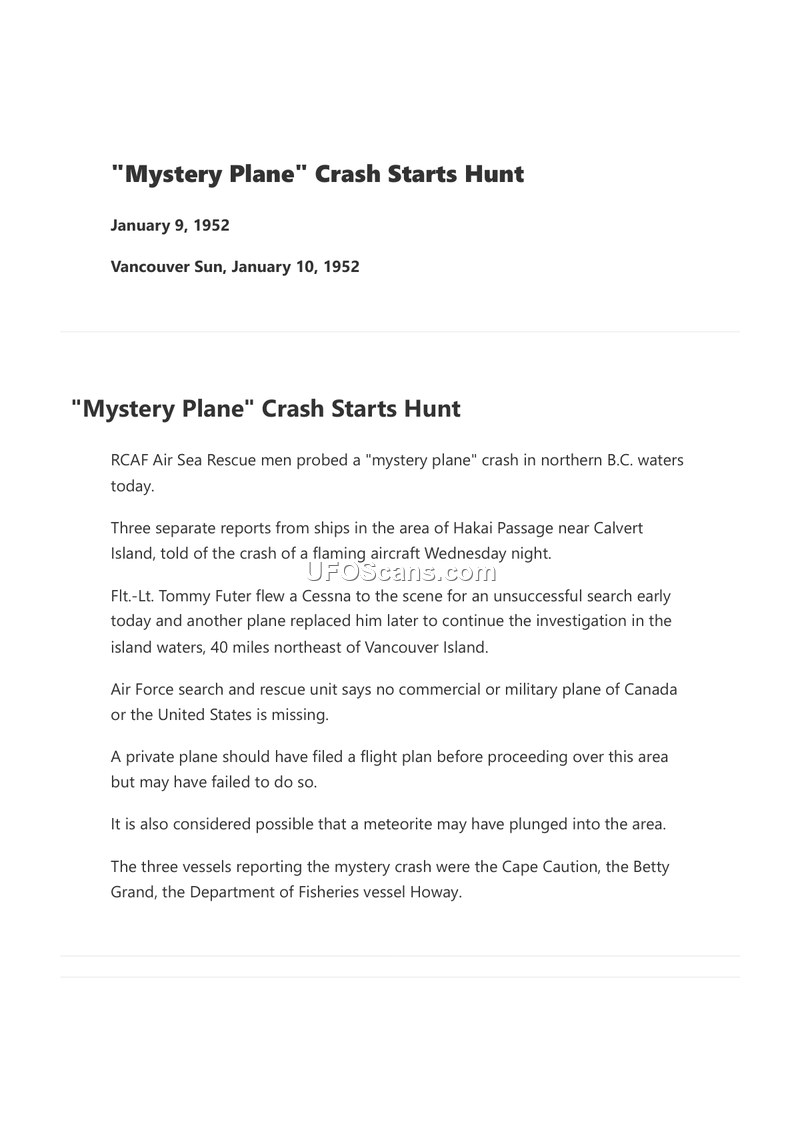 On January 9, 1952, the Royal Canadian Air Force (RCAF) Air Sea Rescue initiated a search operation in the waters of the Hakai Passage near Calvert Island, British Columbia, following reports of a 'mystery plane' crash. Three separate vessels—the Cape Caution, the Betty Grand, and the Department of Fisheries vessel Howay—reported witnessing a flaming aircraft crash on the night of Wednesday, January 9, 1952. Flt.-Lt. Tommy Futer piloted a Cessna to the reported location to conduct an initial search, which proved unsuccessful. A second aircraft was subsequently deployed to continue the investigation in the waters approximately 40 miles northeast of Vancouver Island. The RCAF search and rescue unit stated that no commercial or military aircraft from either Canada or the United States had been reported missing. While officials noted that a private plane might have failed to file a required flight plan, they also suggested the possibility that the observed phenomenon was a meteorite plunging into the area.