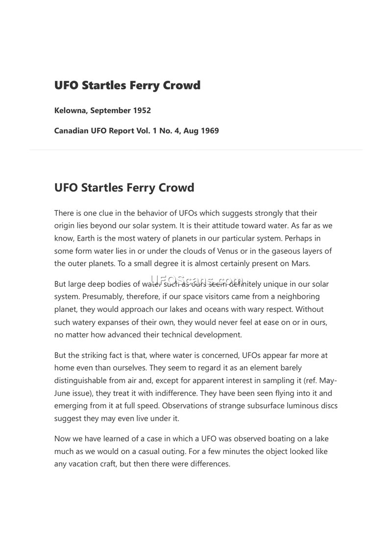 This document details a UFO sighting that occurred in September 1952 near Kelowna, British Columbia, on Lake Okanagan. The report, published in the Canadian UFO Report in August 1969, recounts the experience of three witnesses: Stewart Sanborn, his cousin Dorothy Sanborn, and her late husband, Gordon. While waiting for a ferry, the witnesses observed an object they initially mistook for a boat. The craft was described as having a smooth, round design, appearing like a 'round hard hat sitting on a platter,' and was approximately 30 feet in diameter. The object exhibited a translucent, hazy quality and created a wake on the water as it moved. Suddenly, the wake disappeared, and the object rose into the air, moving toward the ferry dock before stopping silently about 50 feet above the water. Stewart Sanborn, who observed the object through binoculars provided by an American tourist, noted that it hovered for about a minute, giving the witnesses a feeling that they were being watched. The object then traveled across the lake at a speed of approximately 20 m.p.h. before flying parallel to a trail and shooting upward to disappear. The witnesses reported feeling shocked and reluctant to discuss the event afterward. The document also includes a diagram illustrating the flight path of the object relative to the ferry dock and surrounding landmarks.