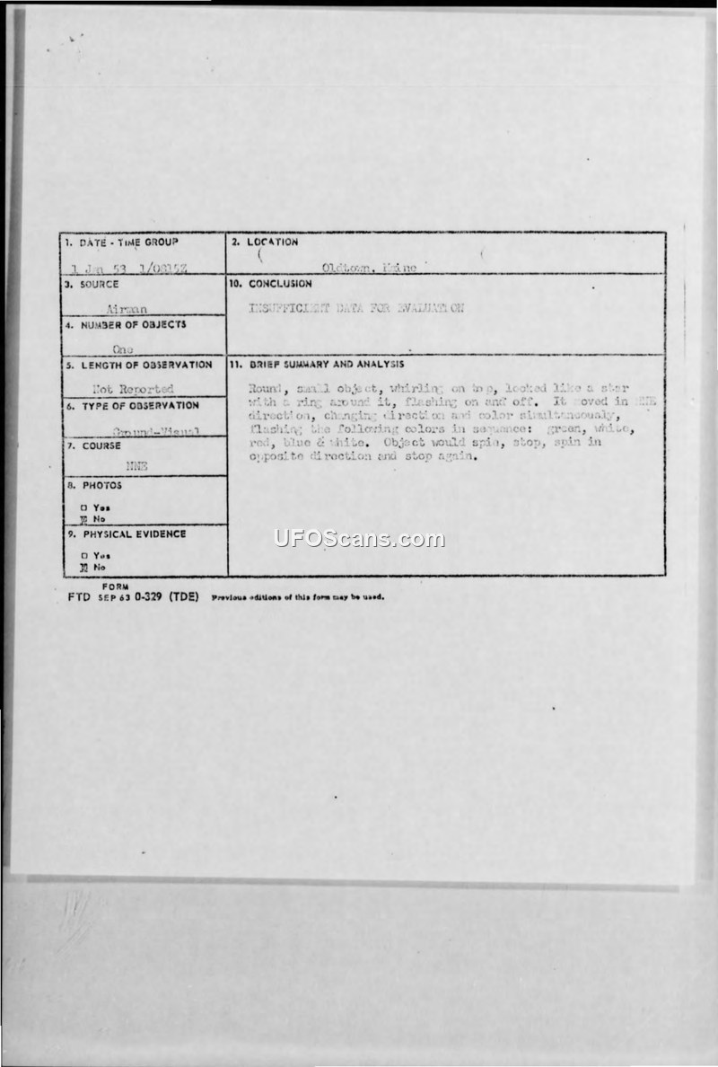 An airman in Oldtown, Maine, reported a small, multi-colored, whirling object on January 1, 1953. Military intelligence concluded there was insufficient data to evaluate the sighting, noting it could potentially be a balloon.