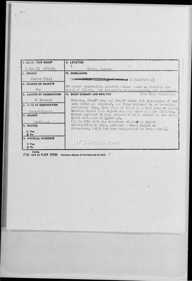 Unidentified Flying Objects — Craig, Montana, 1 January 1953