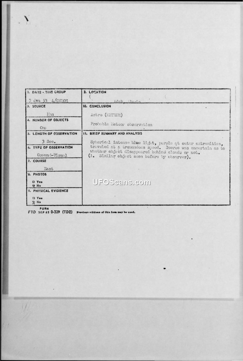 A Staff Sergeant in Adak, Alaska, reported a soundless, spherical blue object on January 3, 1953. Despite the witness's belief that it was not a meteor, official military reports classified the event as an astronomical phenomenon.