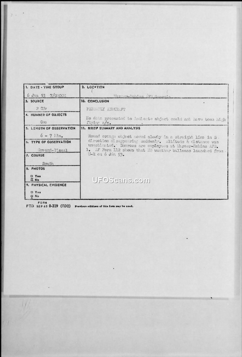 A civilian employee and his wife reported an orange, round, silent object moving slowly over Warner Robins, Georgia, on 6 January 1953. Despite no evidence of aircraft or weather balloons, the official military conclusion was that the object was likely an aircraft.