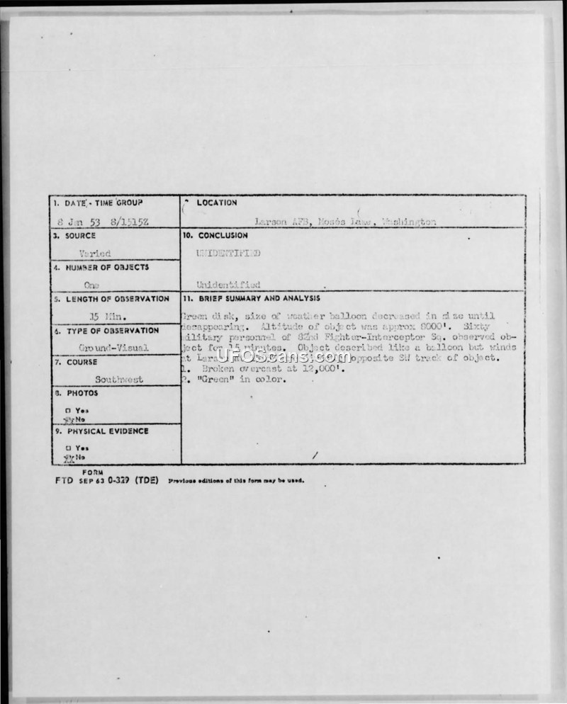 Report of Unidentified Flying Object — Larson AFB, Washington, 8 January 1953