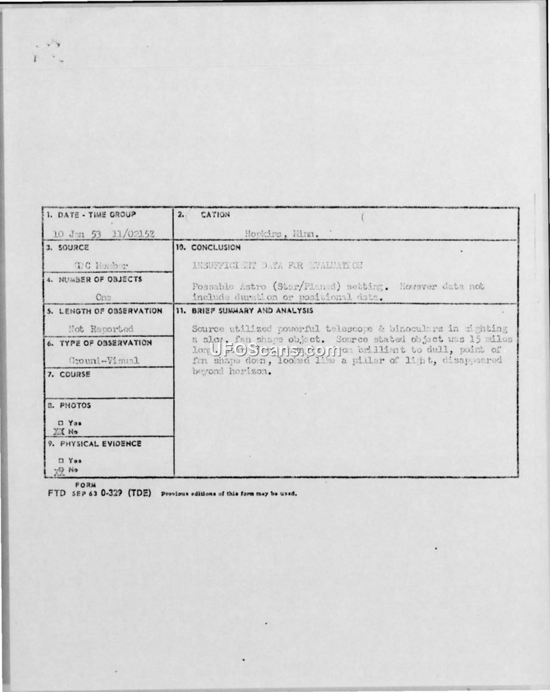 A Ground Observer in Hopkins, Minnesota, reported a 15-mile-long, fan-shaped object on January 10, 1953. The Air Intelligence report concluded there was insufficient data for evaluation, noting it might have been an astronomical phenomenon.