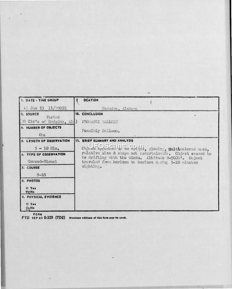 On 11 January 1953, at approximately 1705C, an unidentified flying object was observed by roughly twenty citizens in Gadsden, Alabama. Among the witnesses was the Civilian Air Defense Director and the manager of the Gadsden Airport, who was conducting daily weather observations at the time of the sighting. The object was described as a bright, glowing, multicolored mass, though its specific size and shape could not be determined. It was sighted at an estimated altitude of 8,000 to 9,000 feet, moving from one horizon to the other over a duration of five to ten minutes. The witness, who utilized a pair of binoculars to view the object, noted that it appeared to be drifting with the wind. There were no audible sounds, nor were there any visible exhaust or vapor trails. Weather conditions at the time were reported as clear, with visibility between twelve and fifteen miles and moderate winds from the NNW. The report confirms there was no air traffic in the area during the incident and that the witness was unaware of any meteorological phenomena that would explain the sighting. No physical evidence, such as photographs, was obtained. The official conclusion reached by the 3800th A U Wing at Maxwell AFB was that the object was 'PROBABLY BALLOON'.