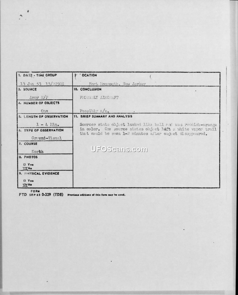 Three military witnesses at Fort Monmouth reported a silent, reddish-orange, round object leaving a vapor trail on 13 January 1953. The official intelligence assessment concluded the object was likely an aircraft.