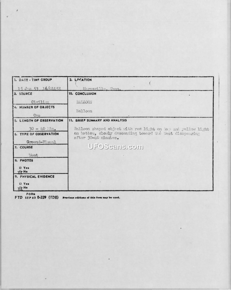 A civilian in Marysville, Tennessee, reported a balloon-shaped object with lights on 15 January 1953. ATIC concluded the object was likely an upper air research balloon.