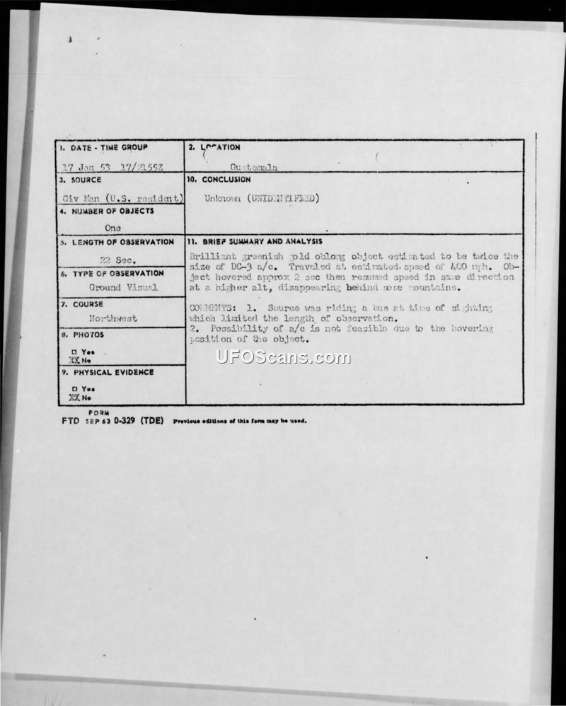 A U.S. citizen in Guatemala reported observing a greenish-gold, oblate-shaped object performing unconventional aerial maneuvers near Volcano Fuego on 17 January 1953. The Air Force investigation concluded the object was unidentified, noting that its flight characteristics were inconsistent with conventional aircraft.