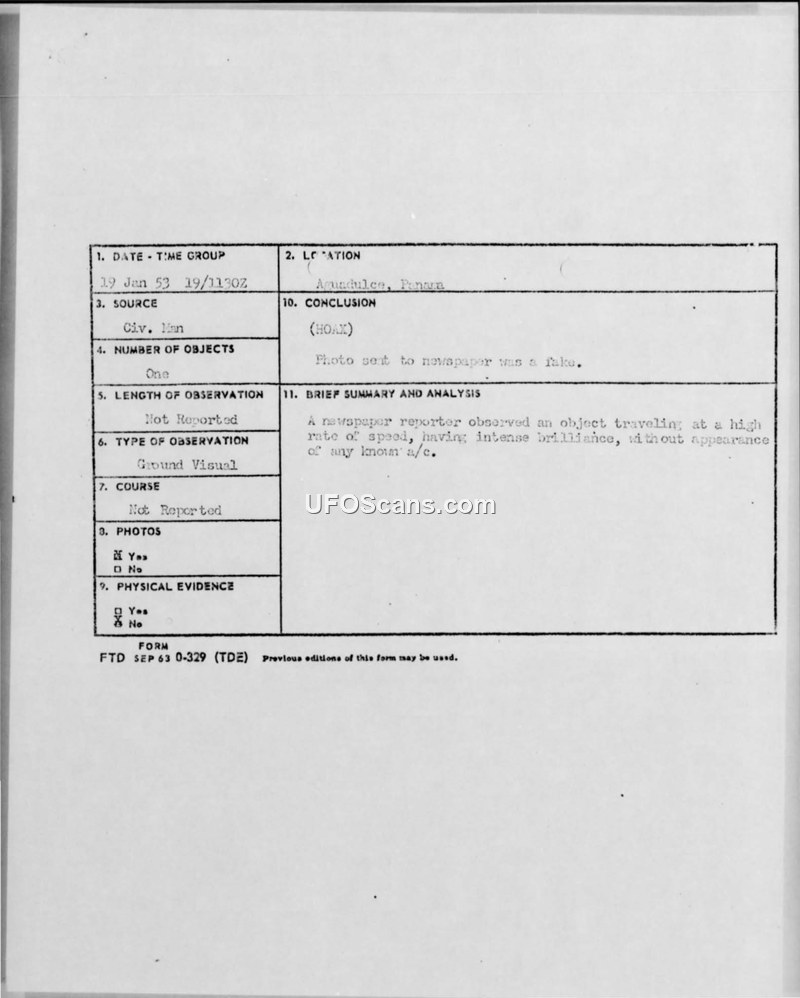 An intelligence report from 1953 investigates a reported UFO sighting in Panama, concluding that the event was a hoax involving a fabricated newspaper story and a manipulated photograph.