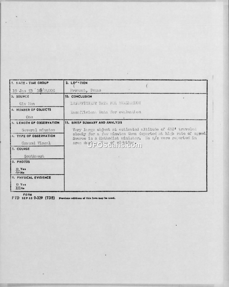 A Methodist minister in Premont, Texas, reported a large, wingless object drifting at 600 feet before departing at high speed. The Air Technical Intelligence Center concluded there was insufficient data for evaluation.