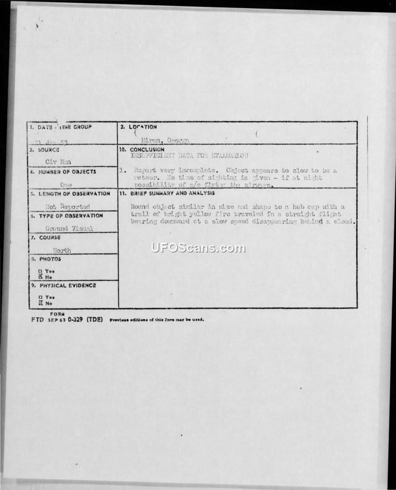 A civilian in Hiram, Georgia, reported a soundless, round, yellow-trailed object on January 21, 1953. The Air Technical Intelligence Center concluded the report was insufficient for evaluation due to the lack of a specific time.