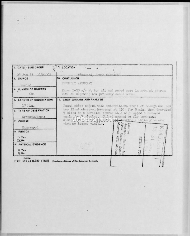 Unidentified Flying Object Report — Pinewood, South Carolina, 25 January 1953