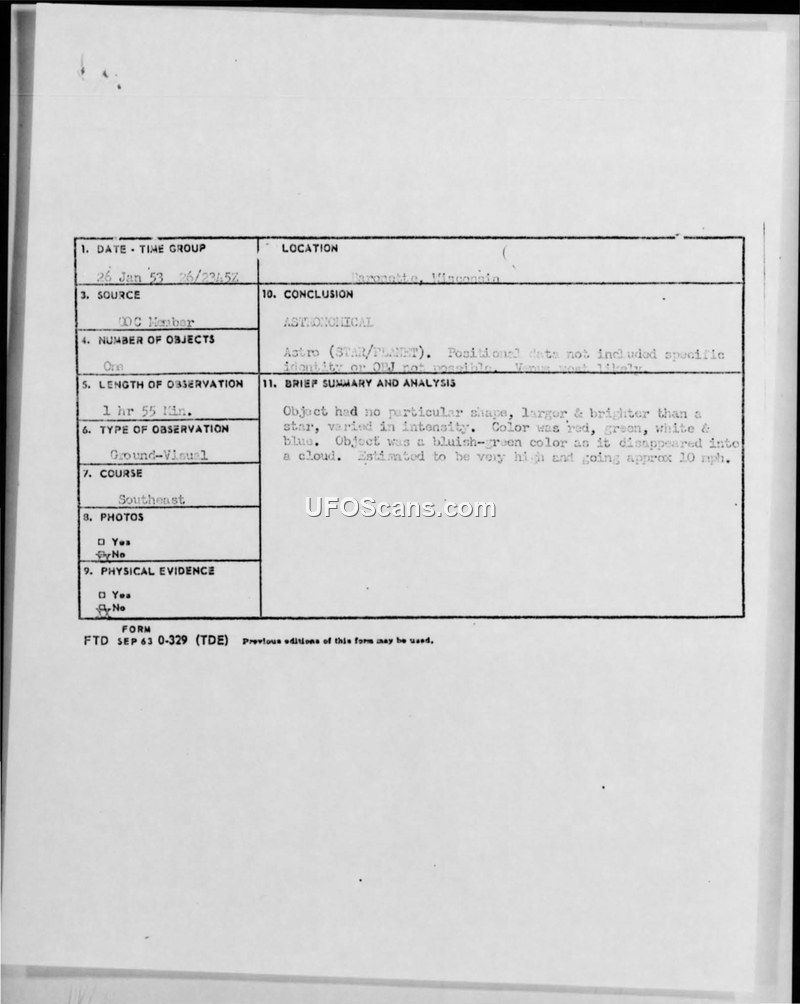 A ground observer in Baronette, Wisconsin, reported a bright, multi-colored object on 26 January 1953. The Air Force concluded the object was likely the planet Venus.