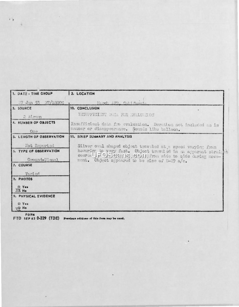 This Air Intelligence Information Report, dated 27 January 1953, documents a sighting of an unidentified flying object near March Air Force Base, California. The report was prepared by Major Keith P. Hansen, USAF, based on the observations of T/Sgt Howard Koonce and S/Sgt Lavon Wise, both of the 307th Air Base Group. The witnesses, who possessed significant experience in identifying aircraft, observed a single, bright silver, oval-shaped object at 1000 hours PST on 27 January 1953. The object was sighted one mile west of the base. According to the report, the object appeared larger than a B-29 aircraft at a similar distance. Its behavior was characterized by an apparent straight flight path, a wobbling motion from side to side, and a speed that varied from a hover to speeds exceeding those of any known aircraft. The observers noted a diffused glow during the object's movement, though the oval shape remained clearly defined when the glow was absent. No trail, exhaust, or audible sound was detected, and the object was observed without the aid of optical or electronic devices. Weather conditions at the time were reported as having unlimited visibility, no cloud cover, and a light wind from the northwest. The official conclusion reached by the evaluating agency, the Air Tech Intel Center, was that there was insufficient data for a definitive evaluation, with a note suggesting the phenomenon 'sounds like balloon.'