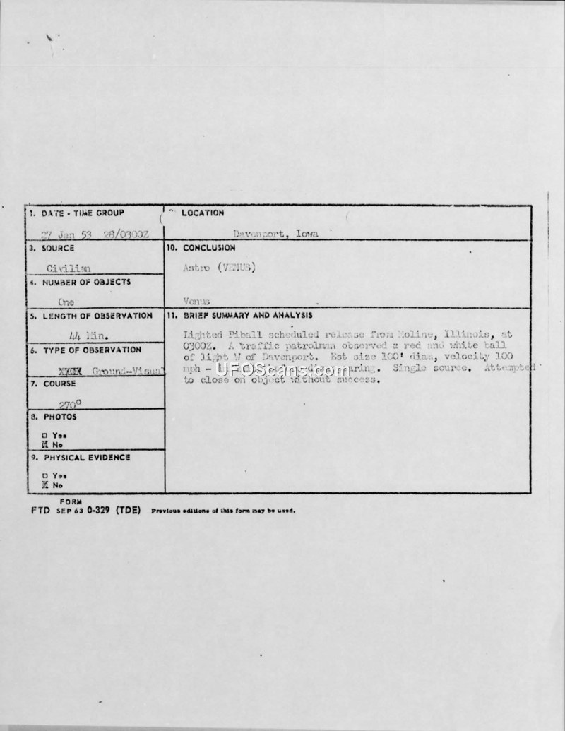 Air Intelligence Information Report — Sighting of 27 January 1953, Davenport, Iowa