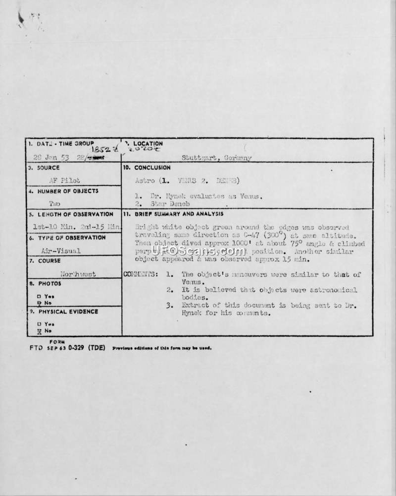USAF pilots reported observing bright, maneuvering lights near Frankfurt, Germany, on January 28, 1953. The Air Technical Intelligence Center concluded the objects were likely Venus and the star Deneb.