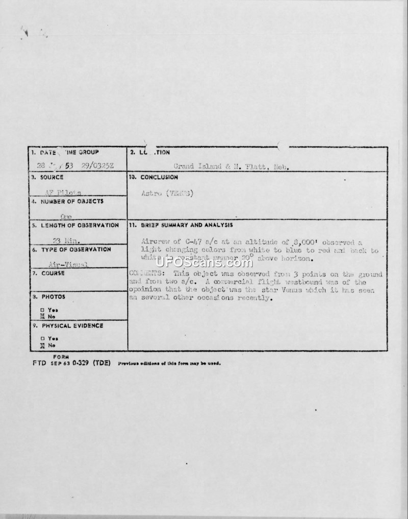 Unidentified Flying Objects Report — Grand Island and North Platte, Nebraska, 28 January 1953