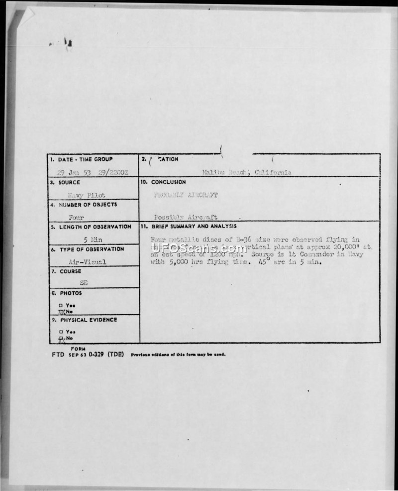 A Navy pilot reported observing four metallic discs in formation near Malibu Beach on January 29, 1953. The Air Technical Intelligence Center concluded that the data provided was insufficient for a formal evaluation.