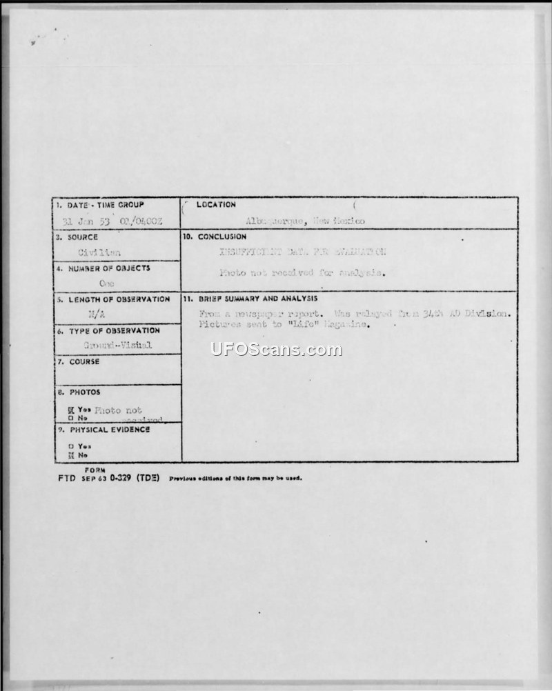 The sighting was reported in a newspaper, but the original negatives were sent to Life Magazine before the Air Force could interview the witness. Dr. La Paz ruled out a meteor.