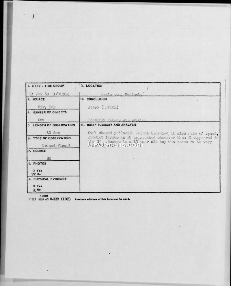 A 13-year-old witness in Lexington, Kentucky, reported an oval, yellowish, self-luminous object on January 31, 1953. The Air Force officially evaluated the sighting as a possible meteor.