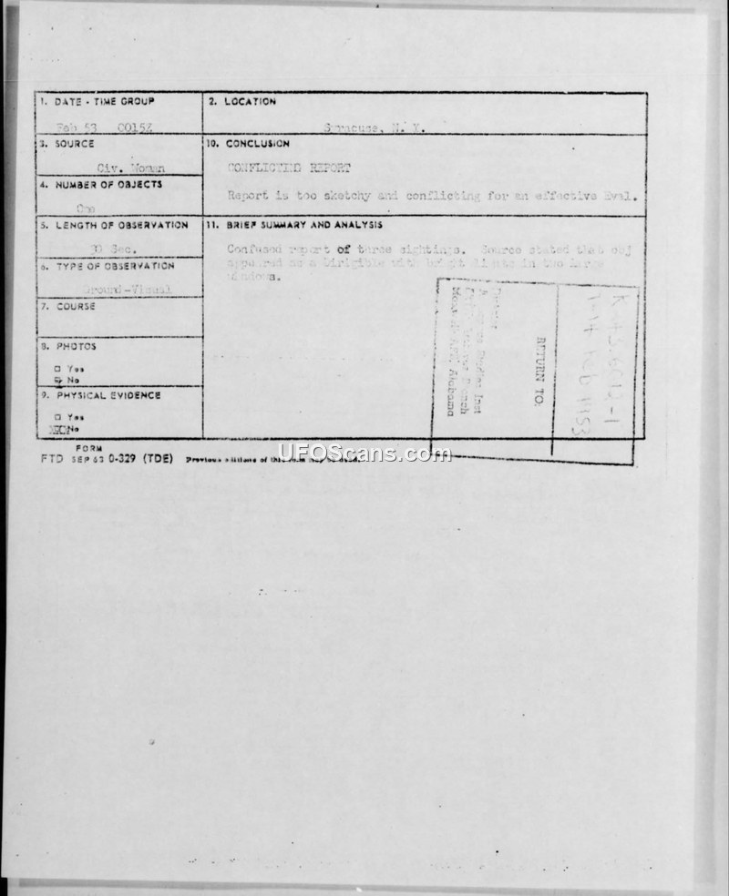 A sighting report from Syracuse, NY, detailing three observations of a dirigible-like object between 1952 and 1953. The Air Force concluded the report was too sketchy and conflicting for evaluation.