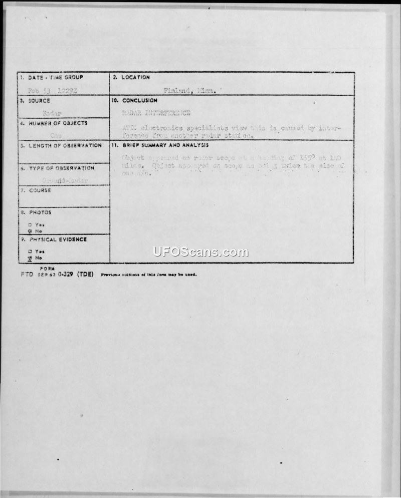 Radar Observation Data Sheet — Finland, Minnesota, February 1953