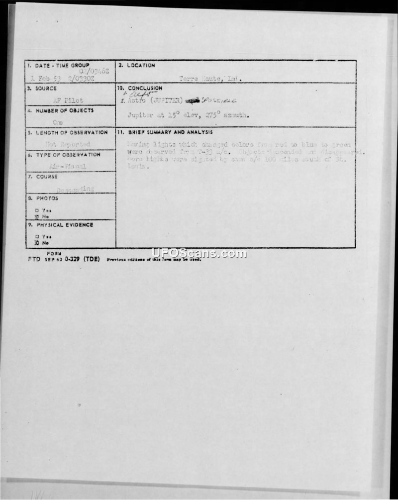 A military pilot reported seeing color-changing lights near Terre Haute, Indiana, on February 1, 1953. ATIC concluded the sighting was likely caused by aircraft illuminated by searchlights from the St. Louis area.