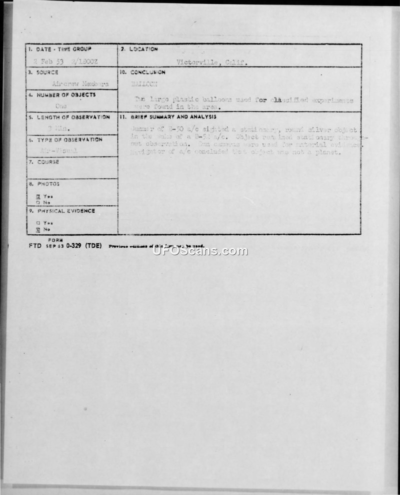 B-50 aircrew reported a stationary silver object near Victorville, California, on 2 February 1953. The object was officially identified as a plastic balloon, though the gun camera film intended to provide evidence was lost in transit.