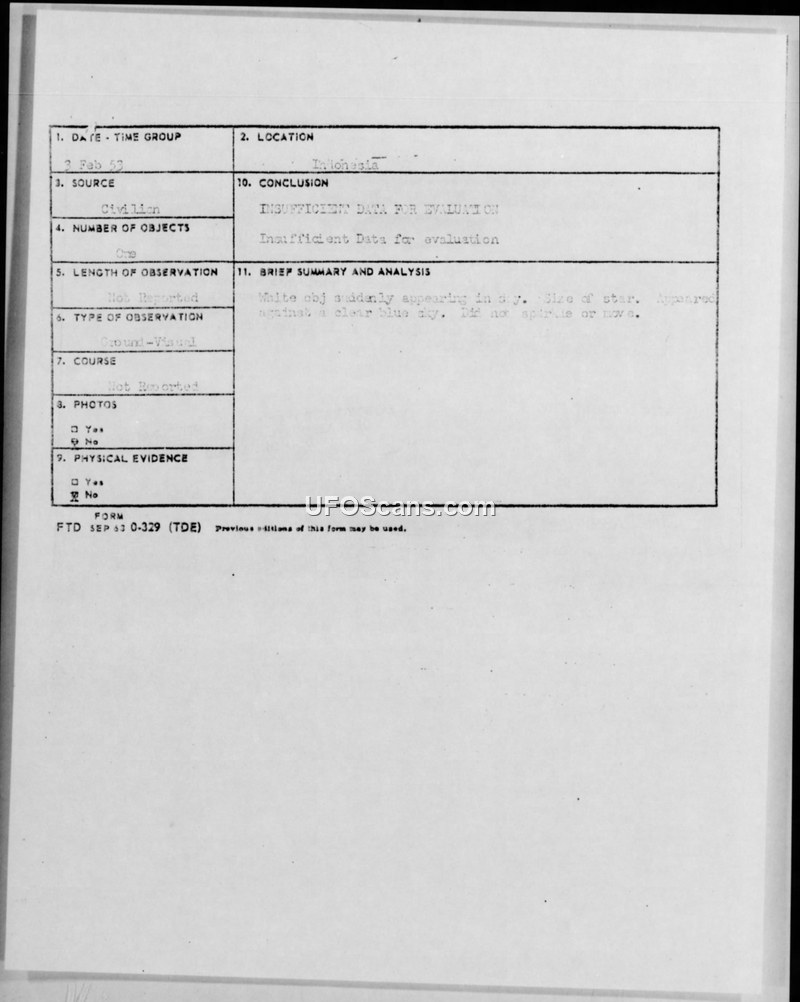 A report on a February 1953 aerial sighting in Semarang, Indonesia, where residents observed a stationary, white, star-like object. The incident was officially classified as having insufficient data for evaluation.