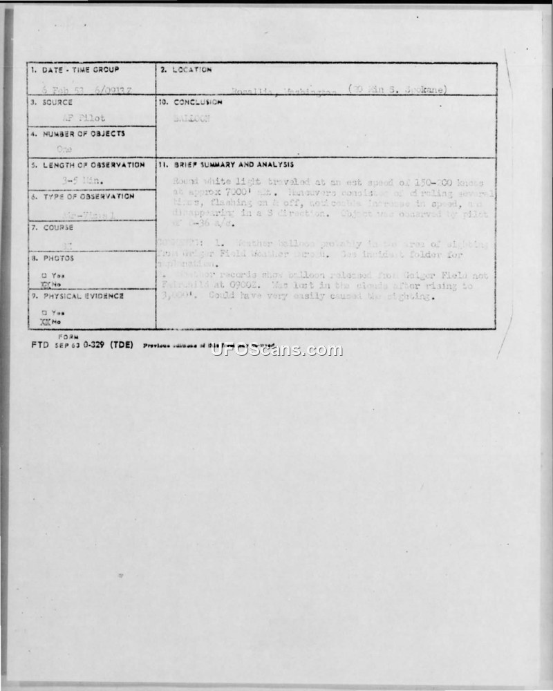 On February 6, 1953, a B-36 aircraft (AF 2708) flying in the vicinity of Spokane, Washington, observed an unidentified aerial phenomenon. The pilot, Major Leo J. Moffatt of the 327th Bomb Squadron, reported sighting a round, white, omnidirectional light at approximately 0913Z. The object was observed at an altitude of roughly 7,000 feet, initially on a southeast course, before performing a descending turn and heading south. The pilot reported that the object circled several times, began flashing at one-to-two-second intervals, and exhibited a noticeable increase in speed before disappearing on a southerly heading. The observation lasted between three and five minutes. No sound was heard, and no exhaust trail or propulsion system was observed. The weather at the time was reported as 1,200 feet broken with 9,000 feet overcast and light drizzle. The Air Technical Intelligence Center (ATIC) conducted an investigation into the incident. They determined that a weather balloon (piball) had been released from the U.S. Weather Bureau station at Fairchild AFB at 0900Z. Based on wind data at 7,000 to 10,000 feet, which was blowing from the west-northwest at approximately 50 knots, ATIC concluded that the balloon would have drifted to the southeast, placing it in the vicinity of Rosalia, Washington, approximately 15 minutes after launch. This timing closely matched the sighting. ATIC concluded that the object was likely a weather balloon, noting that such balloons often carry running lights, which would account for the flashing observed by the pilot. The report includes comments from the preparing officer, who noted that while the light appeared horizontally omnidirectional and did not exhibit a focused beam, the correlation between the flashing and the increase in speed could potentially suggest a propulsive system, though no such system was confirmed. The report explicitly states that no other aircraft were in the area at the time of the sighting and that radar sites did not report the incident. The case file includes one photograph and two photocopied charts.