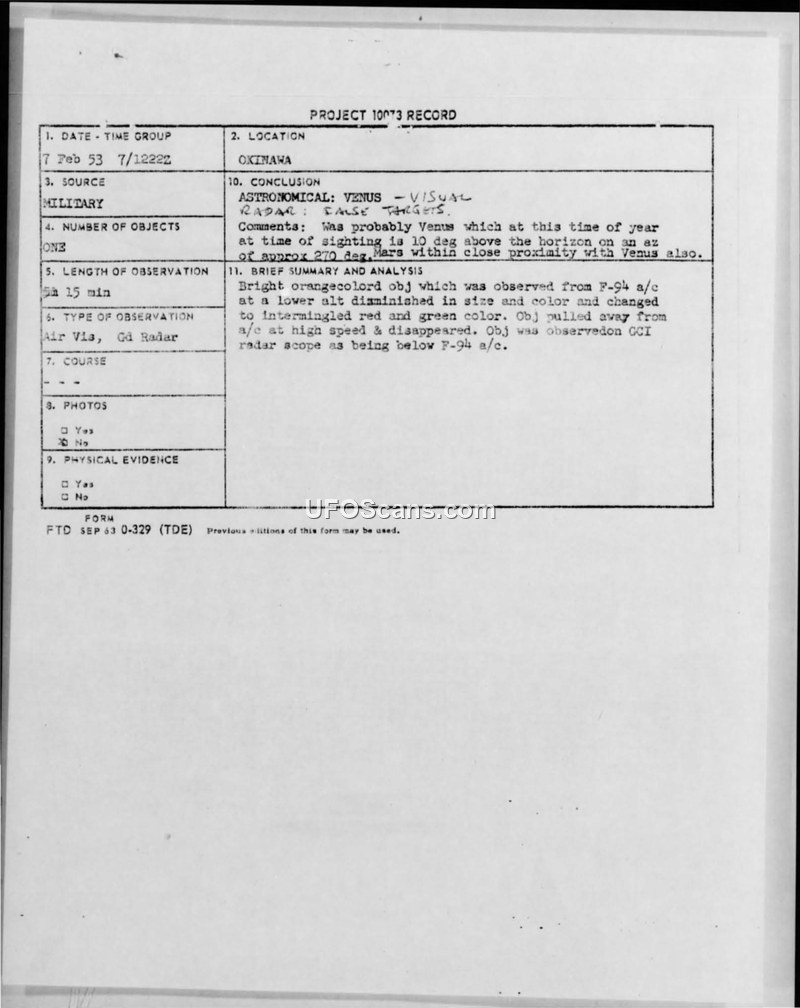 On 7 February 1953, at 2122 local time, ground radar at Okinawa tracked an unidentified aerial object. An F-94 interceptor was scrambled at 2123 hours to investigate. While the F-94's airborne radar failed to detect the object, the pilot reported a visual sighting at 2145 hours. The pilot described the object as a bright orange light that changed to red and green. The object was observed to diminish in size and color before pulling away at high speed and disappearing. The F-94 chased the object to a position 145 miles from the GCI station before breaking off due to a shortage of fuel. The object was also observed on the GCI radar scope as being below the F-94. The weather conditions at the time were reported as scattered stratus clouds. Subsequent analysis by the Air Technical Intelligence Center (ATIC) concluded that the sighting was likely the planet Venus. Investigators noted that Venus was extremely bright at that time of year and was located at an azimuth of 270 degrees, 10 degrees above the horizon. It was determined that the ground radar likely received a spurious plot, leading to the vectoring of the F-94 toward the planet. The report explicitly states that no strict correlation between the electronic radar data and the visual contact could be established.