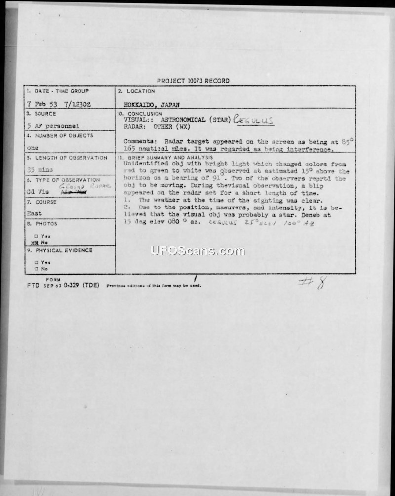 Project 10073 Record — Sighting at Nemuro AF Detachment, Hokkaido, Japan, 7 February 1953