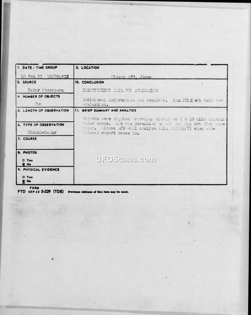 On 10 February 1953, unidentified radar targets were tracked at Misawa AFB, Japan, accompanied by reports of radar and VHF interference. An F-94 interceptor was scrambled but failed to locate the objects, leading to an 'insufficient data' conclusion.