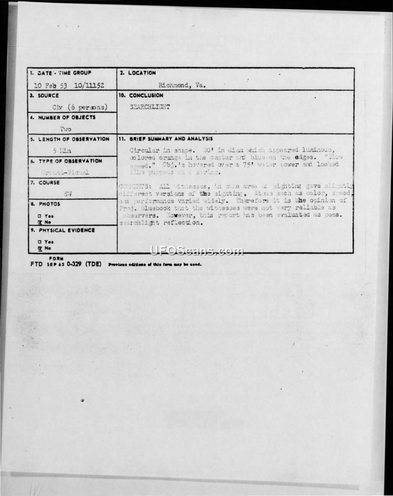 Four civilian guards at the Richmond Quartermaster Depot reported observing two silent, luminous, circular objects performing erratic maneuvers on February 10, 1953. Despite the witnesses being deemed reliable, the investigation found significant discrepancies in their accounts and reached no definitive conclusion.