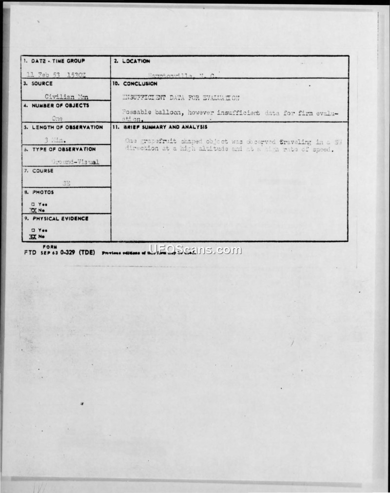 UAP Sighting Report — Hamptonville, North Carolina, February 11, 1953