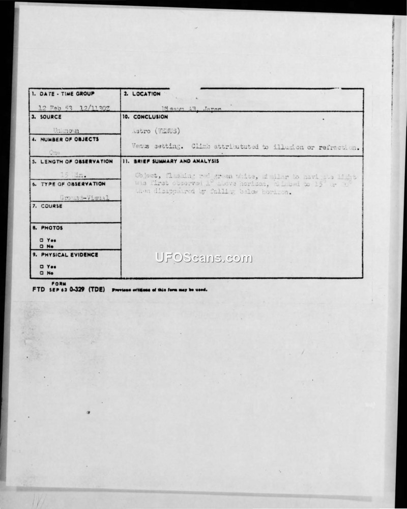 A 1953 military report from Misawa Air Base details a 15-minute sighting of a flashing object at Nemuro, Japan. The object was officially identified as the planet Venus, with its perceived movement attributed to atmospheric refraction.