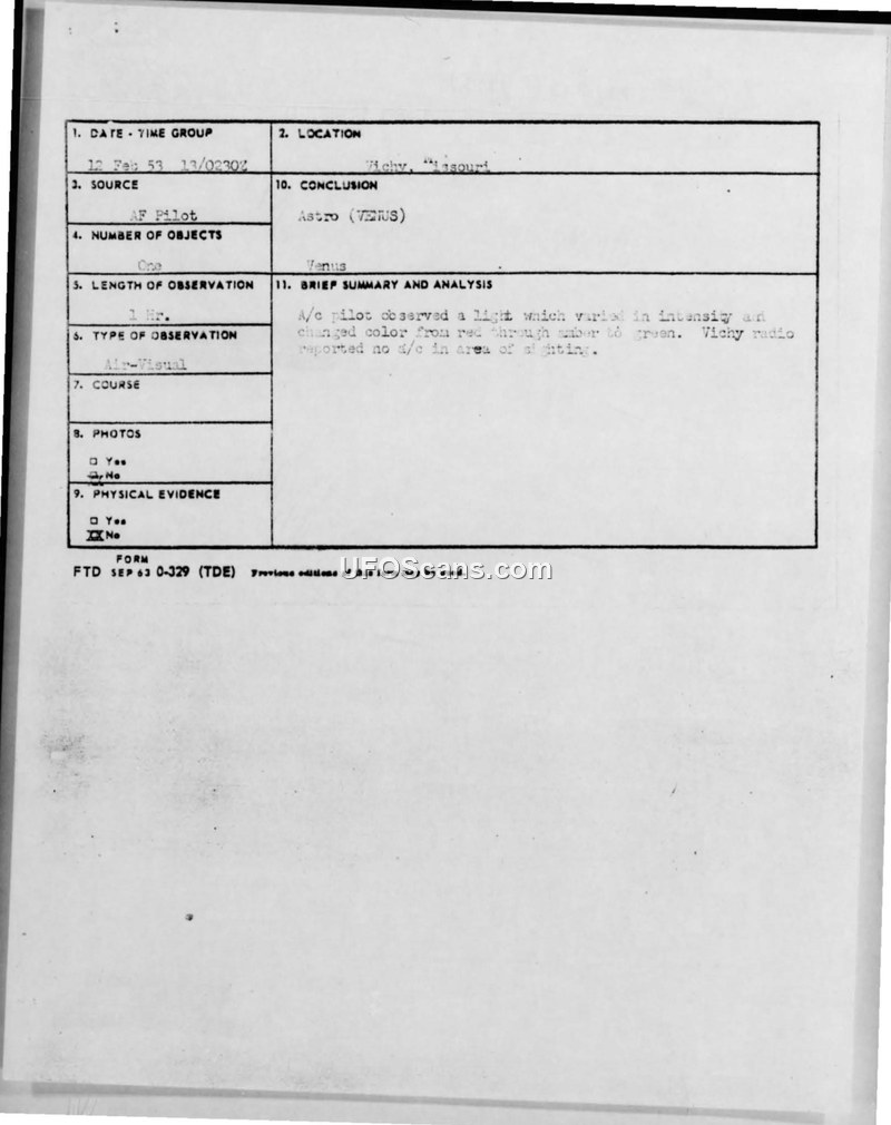 A C-47 pilot reported an unidentified light near Vichy, Missouri, on 12 February 1953. Air Force intelligence concluded the object was the planet Venus.