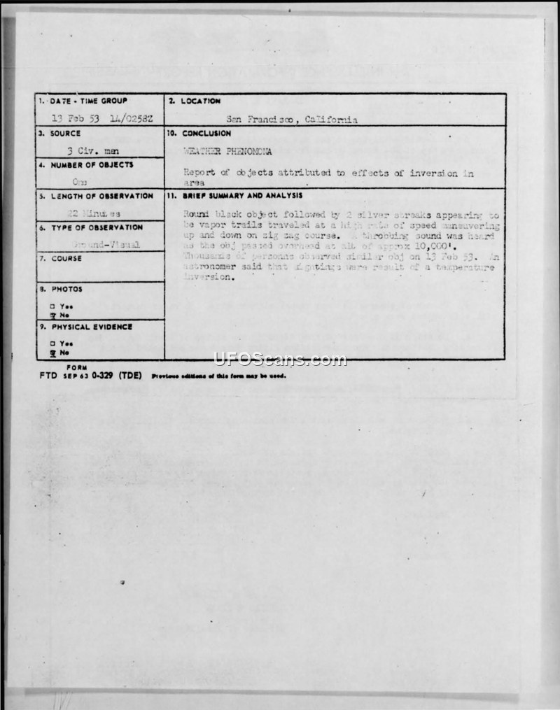 On 13 February 1953, GOC observers in San Francisco reported a maneuvering black object with silver streaks. Military intelligence concluded the sighting was a weather-related temperature inversion.