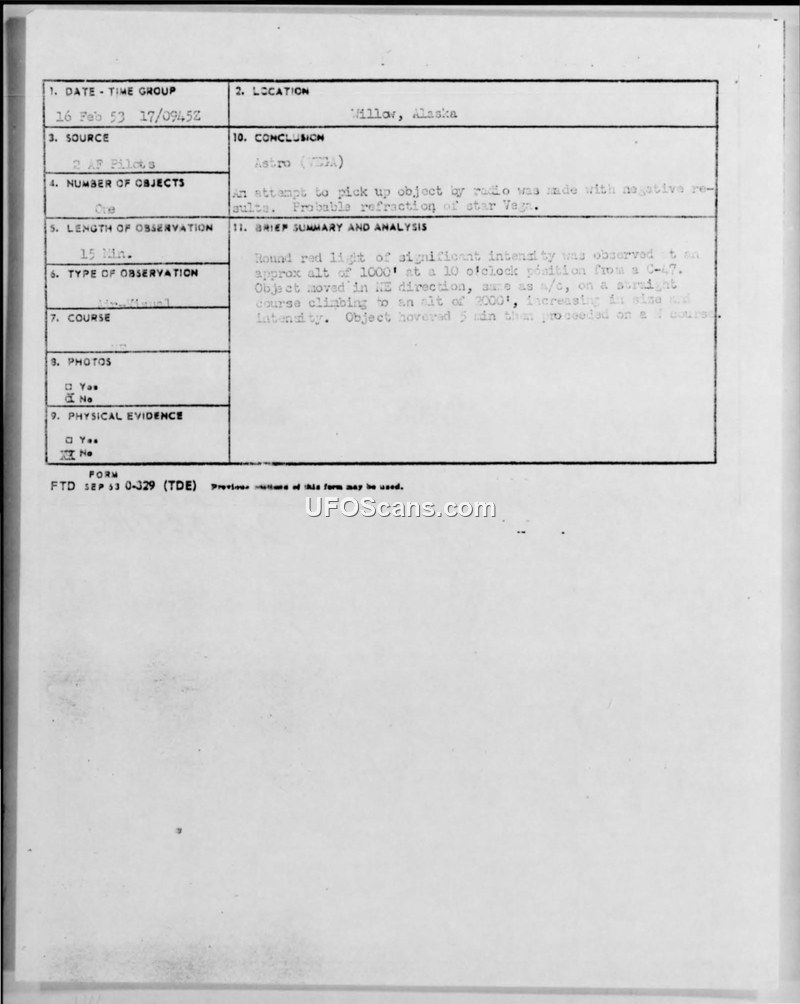 Two USAF pilots reported a 15-minute sighting of an unidentified, maneuvering red light over Alaska in February 1953. Despite radar and tower inquiries, the object remained unidentified, with an official conclusion later suggesting it was a refraction of the star Vega.