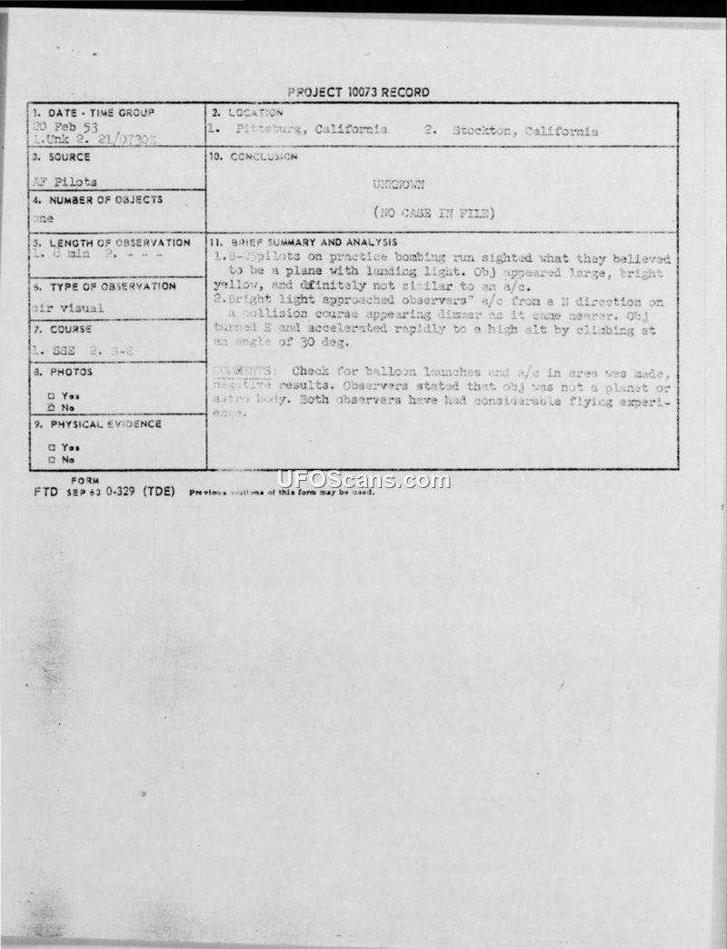 This document is a Project 10073 record detailing an unidentified aerial phenomenon sighting that occurred on February 20, 1953, in the vicinity of Pittsburg and Stockton, California. The report involves Air Force pilots who were conducting a practice bombing run when they observed an object. Initially, the pilots believed the object to be an aircraft with its landing light illuminated. The object was described as large and bright yellow in color. As the encounter progressed, the object, which was initially on a collision course from a northern direction, appeared to dim as it approached the observers' aircraft. Subsequently, the object executed a turn to the east and accelerated rapidly, climbing to a high altitude at a 30-degree angle. The duration of the observation was recorded as eight minutes. The investigation into the incident included checks for balloon launches and other aircraft in the area, both of which yielded negative results. The observers, noted as having considerable flying experience, explicitly stated that the object was not a planet or an astronomical body. The final conclusion recorded for the case is 'UNKNOWN', and it is noted that there is no case file. The document includes a map sketch illustrating the flight path, showing the initial observation point, the area where the object stopped and flashed, and the direction of its departure.