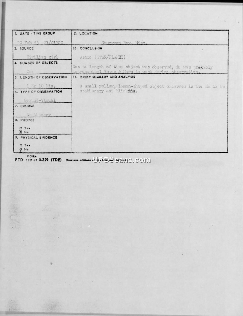 A 15-year-old witness reported a stationary, yellow, lemon-shaped object in Sturgeon Bay, Wisconsin, on February 20, 1953. The U.S. Air Force concluded the sighting was likely the planets Venus and Mars.