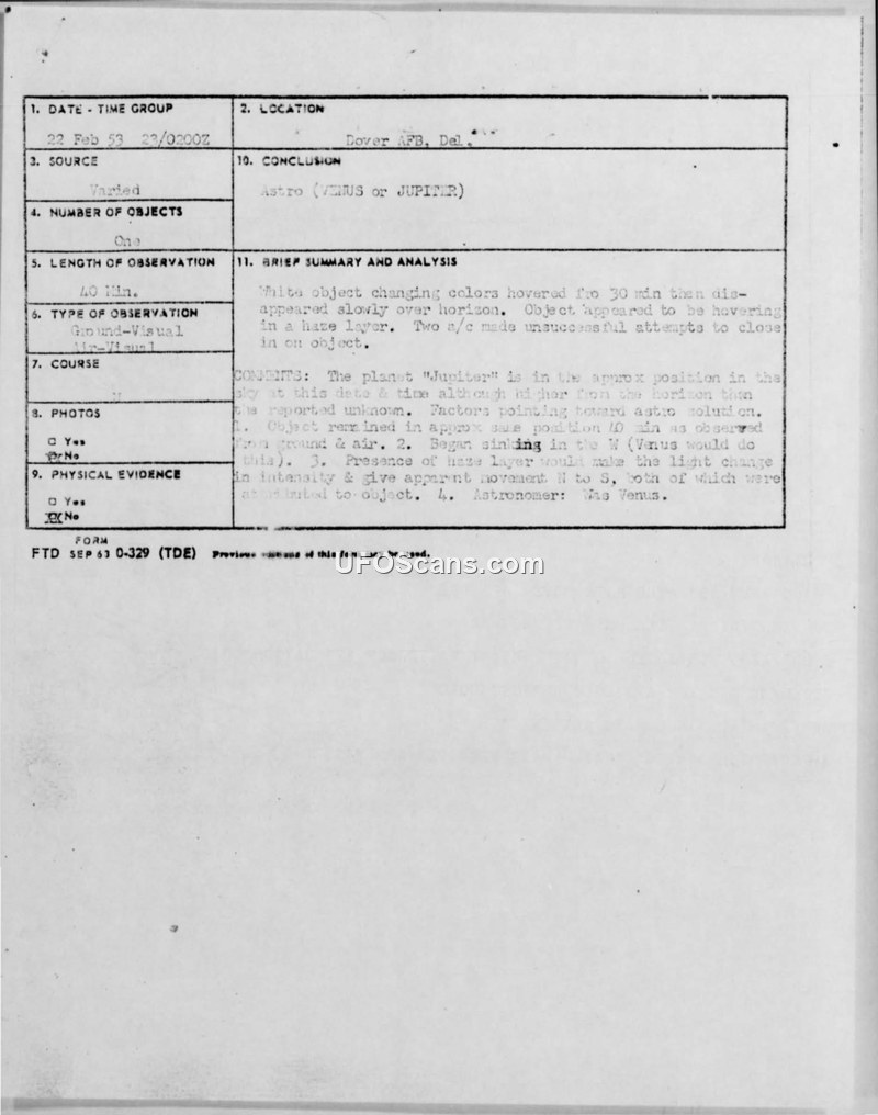 Multiple military and civilian witnesses observed a bright, color-changing object near Dover AFB on February 22, 1953. Intercept attempts by fighter aircraft were unsuccessful, and the object was officially identified as the planet Jupiter or Venus.