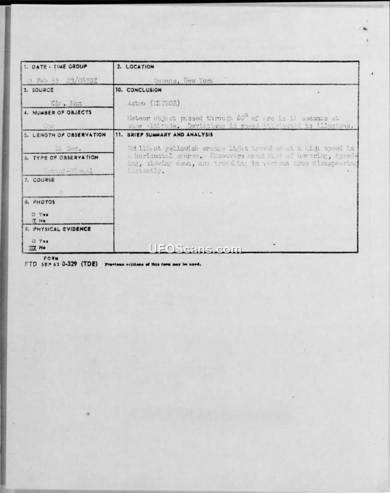 A 1953 Air Force investigation into a UFO sighting in Queens, New York, by a True magazine employee. The object was officially identified as a meteor.