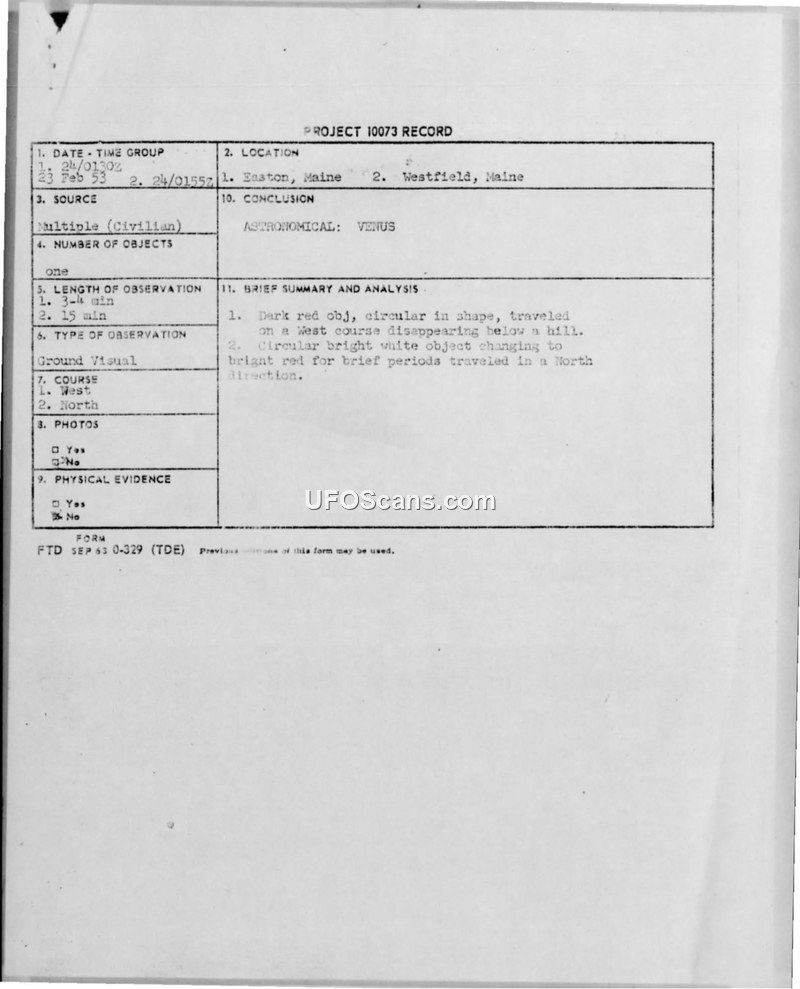 Civilian witnesses in Maine reported an unidentified light in February 1953 that changed color and moved across the sky. The Air Force investigated the reports and officially concluded the object was the planet Venus.