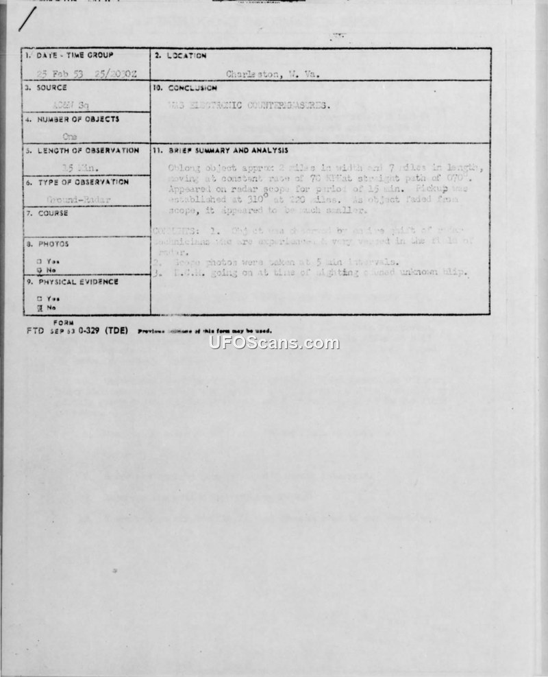 A 1953 radar sighting of an oblong object near Charleston, West Virginia, was officially attributed to electronic countermeasures by the 30th Air Division. The report includes technical radar data and notes that the sighting was observed by experienced radar personnel.