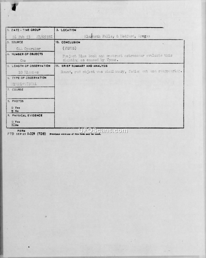 This intelligence report, dated 2 March 1953, documents a sighting of an unidentified flying object that occurred on 26 February 1953 in the vicinity of Klamath Falls and Medford, Oregon. The object was observed by a CAA Radio Operator and an unidentified observer for a duration of 10 minutes. The object was described as a round, red, glowing entity that remained stationary but appeared to fade in and out intermittently before eventually disappearing. The observer estimated the object's altitude at 10,000 feet and its position at a 270-degree azimuth. Weather conditions at the time were reported as having scattered clouds at 2,000 feet with 10 miles of visibility. The report, authored by Major Gerald E. Tyler of the USAF, confirms that no photographs or sketches were submitted, no interception was attempted, and there was no report of other air traffic in the area. Following an evaluation by Project Blue Book and its contract astronomer, the incident was officially concluded to be the planet Venus. The report notes that such sightings are common, as the planet is often mistaken for an unidentified object when viewed low on the horizon, particularly when atmospheric haze causes it to appear to change color or fade.