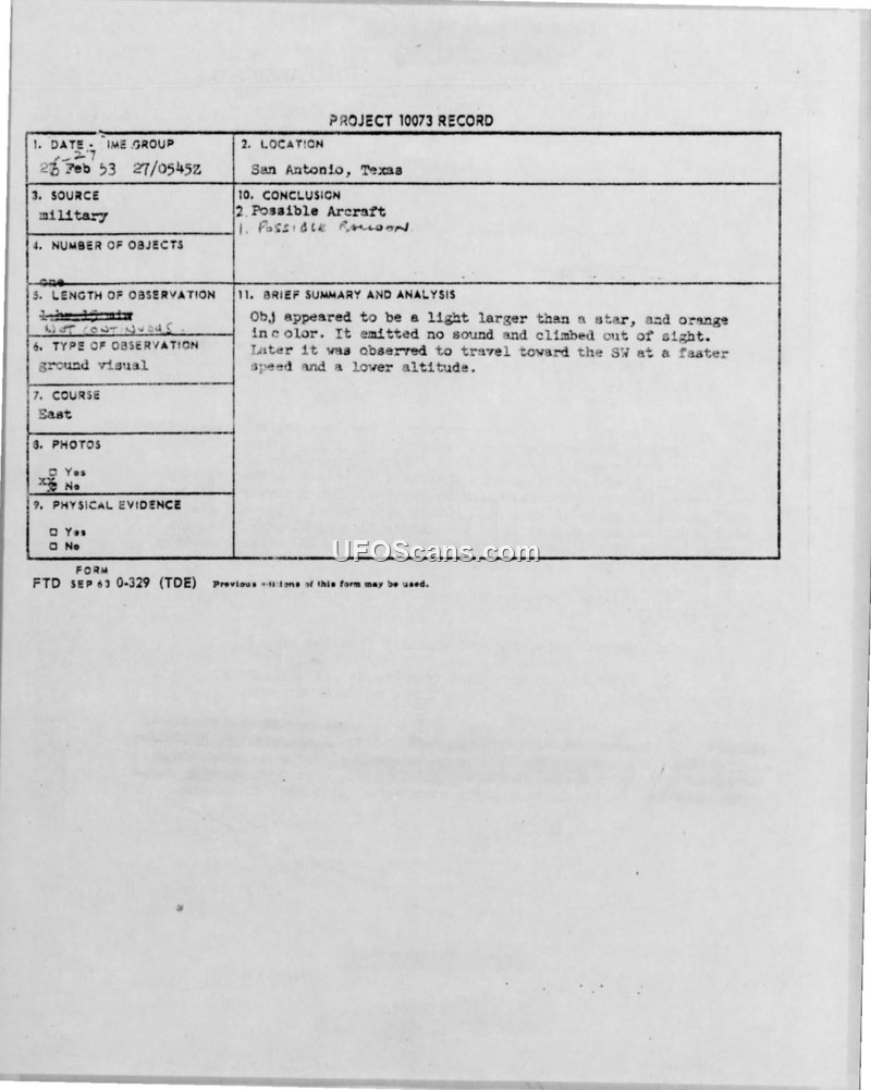 Multiple military personnel at Brooks Air Force Base observed silent, high-speed, glowing objects performing unusual maneuvers on the night of 26-27 February 1953. Despite the lack of conventional explanation, the official conclusion was 'Possible Aircraft'.