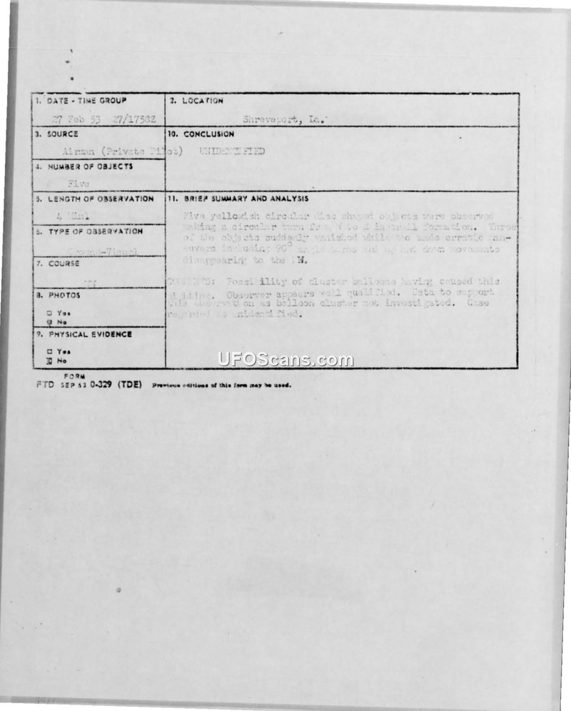 A private pilot reported five unidentified circular objects over Shreveport, Louisiana, on 27 February 1953. Despite a suggestion that they might be cluster balloons, the case remained officially unidentified.