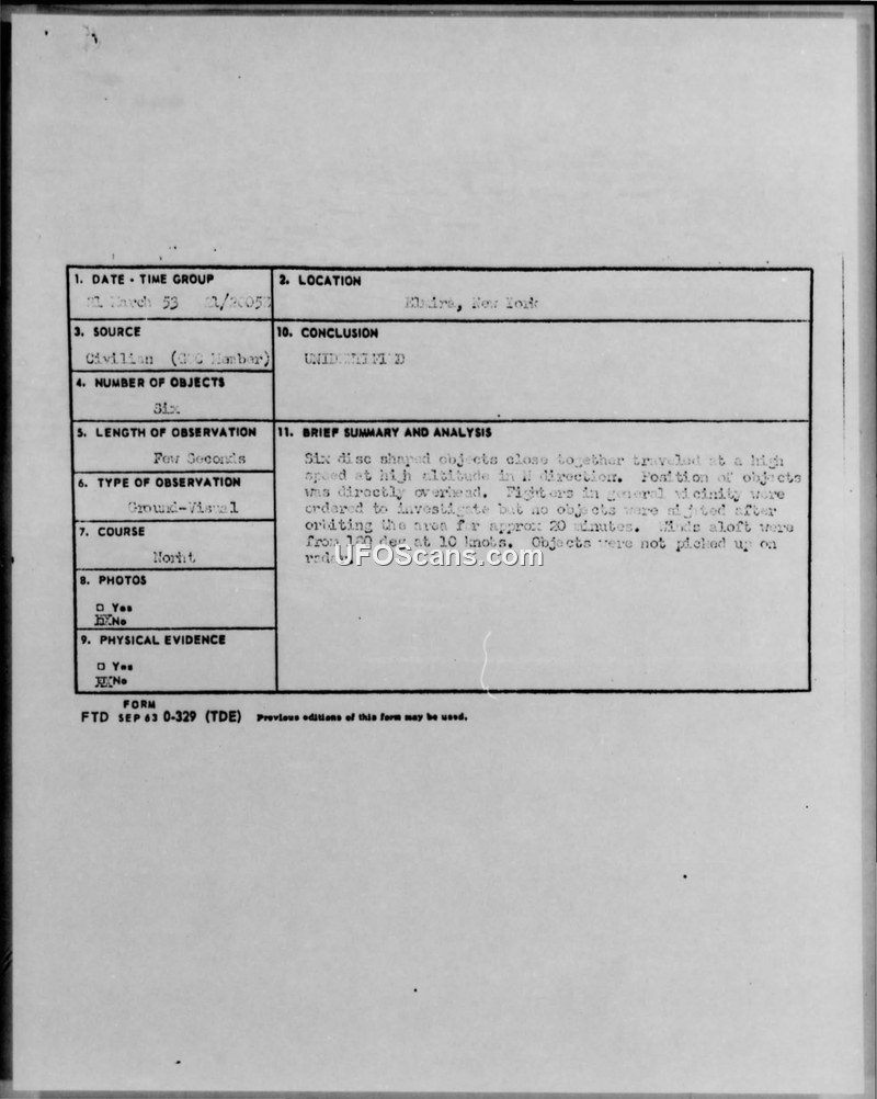 On March 21, 1953, at approximately 1505 EST, two members of the Ground Observer Corps (GOC), Mr. Holup and Mr. Jack O'Niel, stationed at GOC Post # PN 00 Black in Elmira, New York, observed six disc-shaped objects. The witnesses reported that the objects were at a very high altitude and were moving rapidly toward the north. The observers utilized binoculars to view the objects, though the duration of the sighting was limited to only several seconds. The weather conditions at the time were reported as clear, with winds from the south at 10 knots. Following the report, military aircraft in the general vicinity were ordered to investigate the area. These aircraft orbited the location for approximately 20 minutes but failed to sight any unknown objects. Furthermore, the objects were never detected by radar at the site. The official Air Intelligence Information Report, authored by Captain Thomas C. Schiebel, notes that the authenticity of the report remains unknown due to the extremely brief duration of the observation. An investigator's note on the report suggests the possibility that the objects may have been balloons or paper being carried by the wind. The report was processed under Project Blue Book and includes correspondence between the 655th ACW Squadron and the Air Technical Intelligence Center at Wright-Patterson Air Force Base.