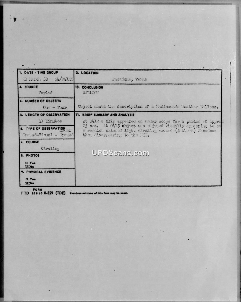 A sighting of a reddish, circling light over Pasadena, Texas, on 23 March 1953 was reported by seven witnesses and tracked briefly on radar. The official conclusion attributed the phenomenon to a lighted radiosonde weather balloon.